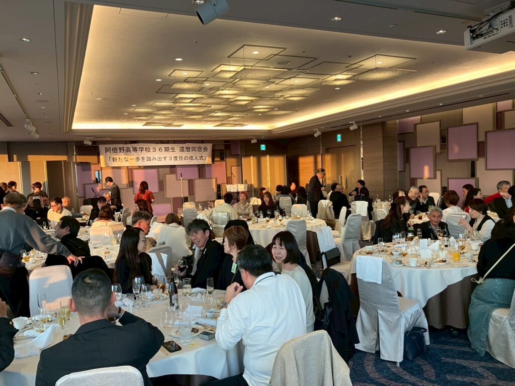 令和7年11月15日、36期還暦同窓会を大阪マリオット都ホテルにて開催し、84名が集まりました。会場の20階からは母校の校舎が望め、夕陽がゆっくりと街を染めていく美しい景色に包まれながら、節目を迎えた同級生が再び笑顔を交わす、特別な時間となりました。