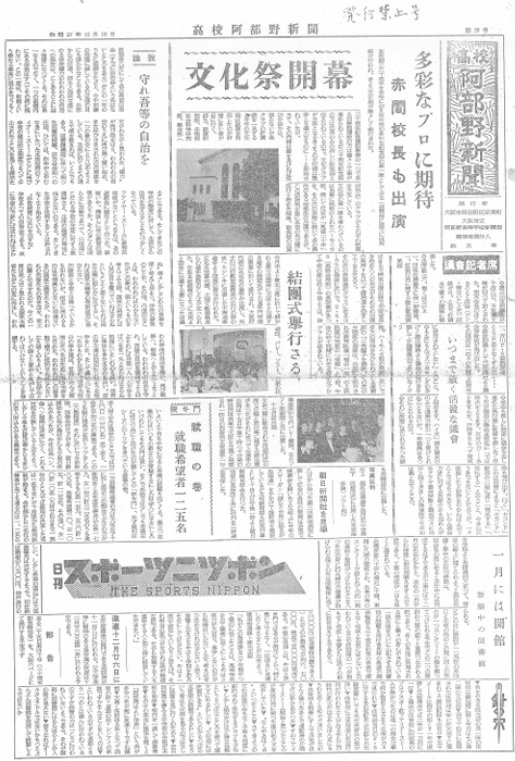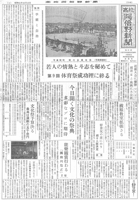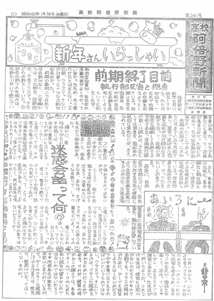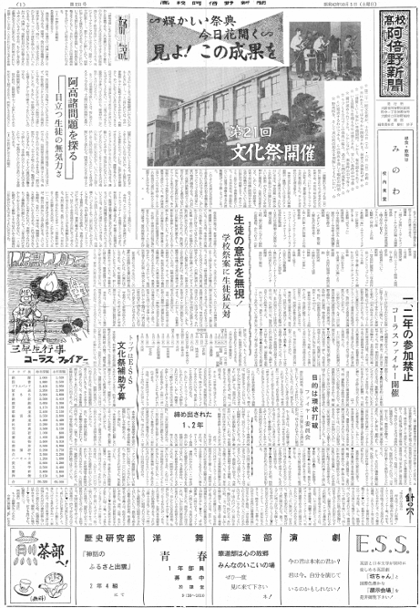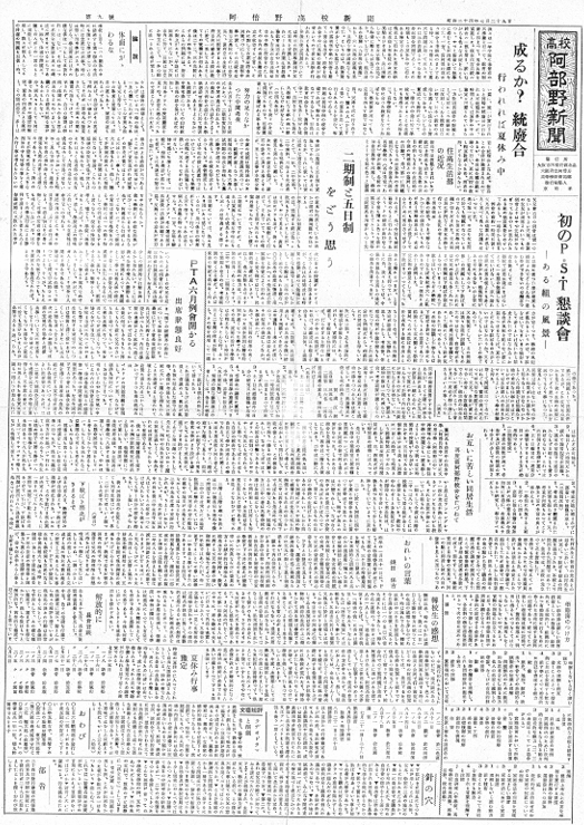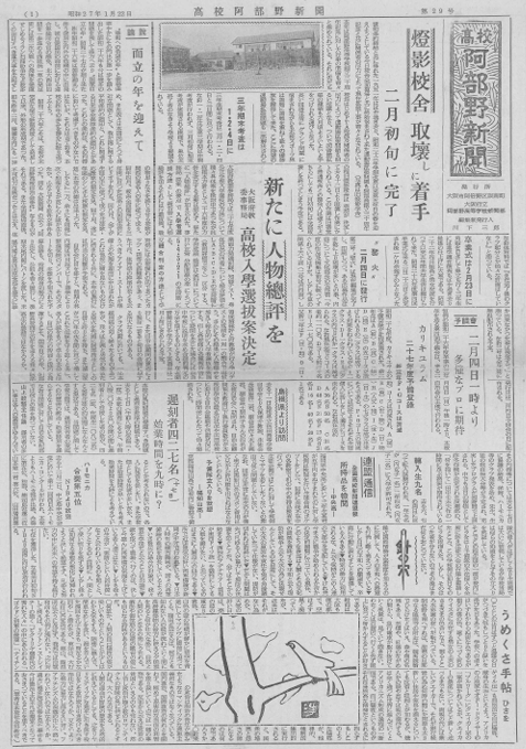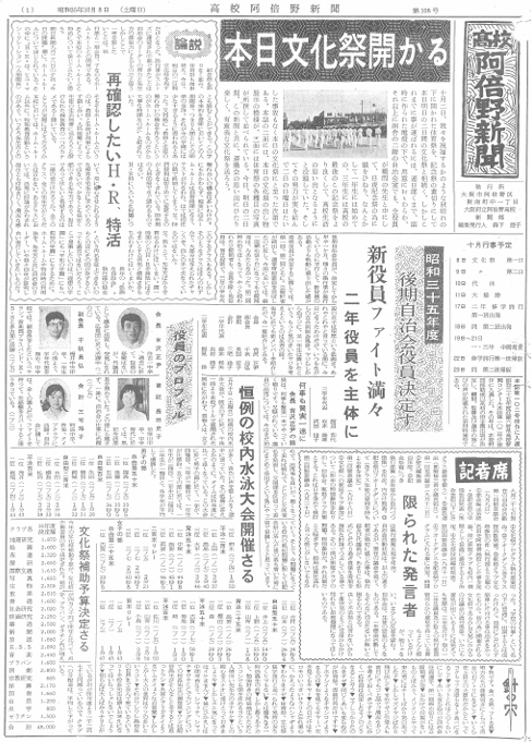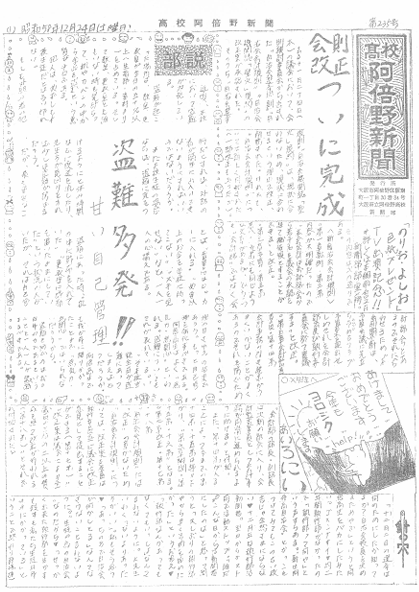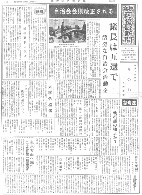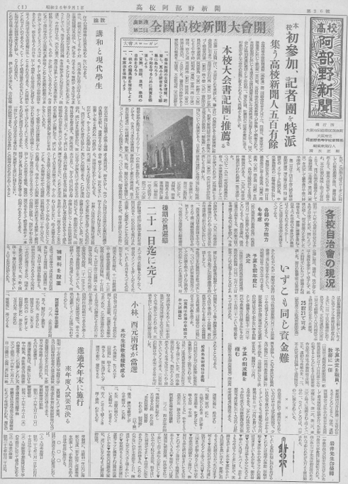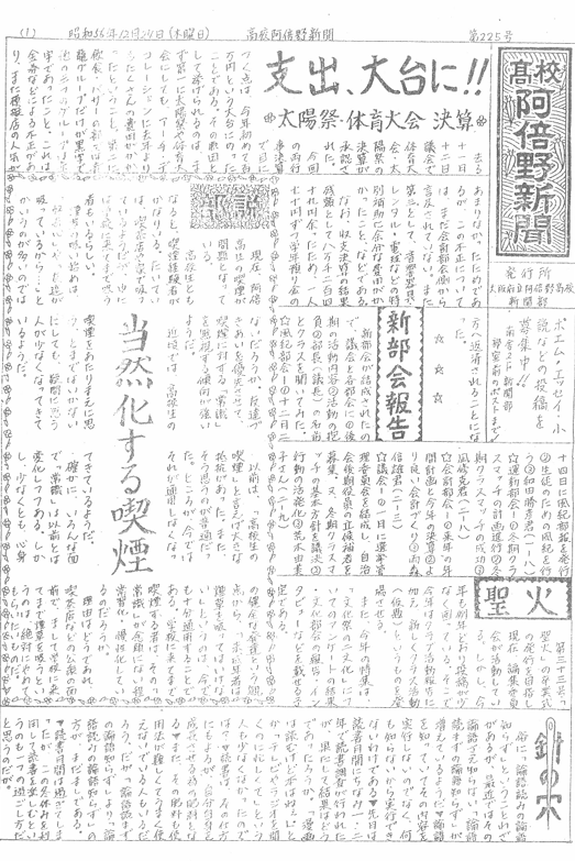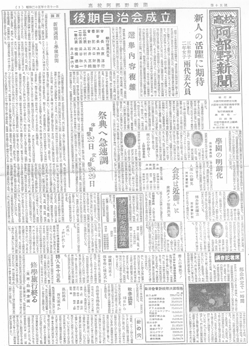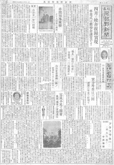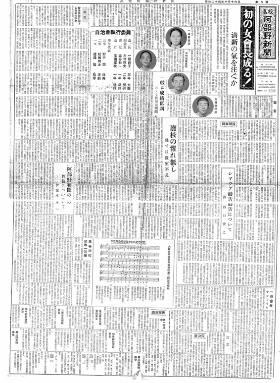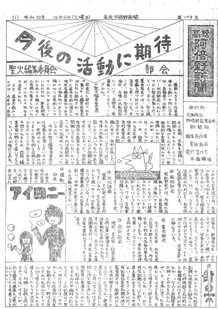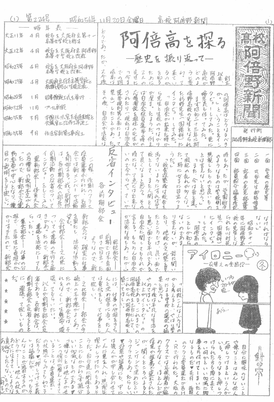 OB( OG間で連絡が廻り、その年の11月26日に有志10名ほどが芝蘭会館 に集まりました。保管されていた高校阿倍野新聞は、欠落はあるものの、昭 和23(1948)年の創刊第1号から「編集後記」に「最後の挨拶」が記されて いる昭和61(1986)年の第244号まで揃っているだけでなく、昭和 22(1947)年発行の阿部野高等女学校時代の「曙」や新制高等学校制度への 移行過程の「阿部野新聞」まで残っていました 後に平成2(1990)年発行の 第248号まで確認)。