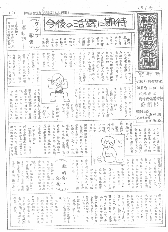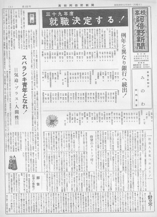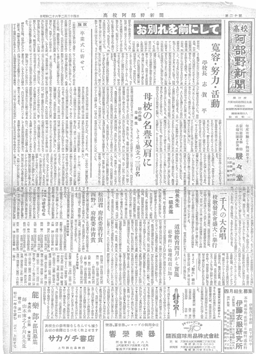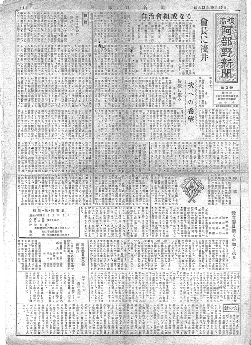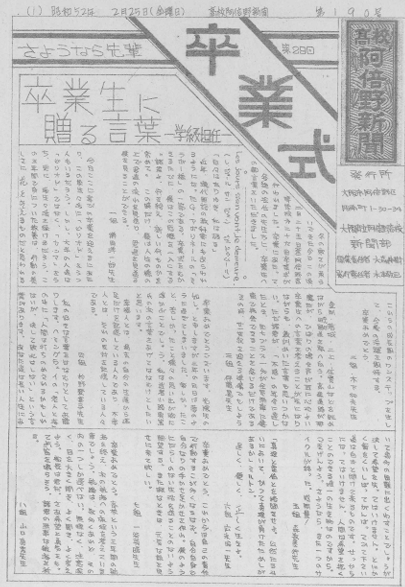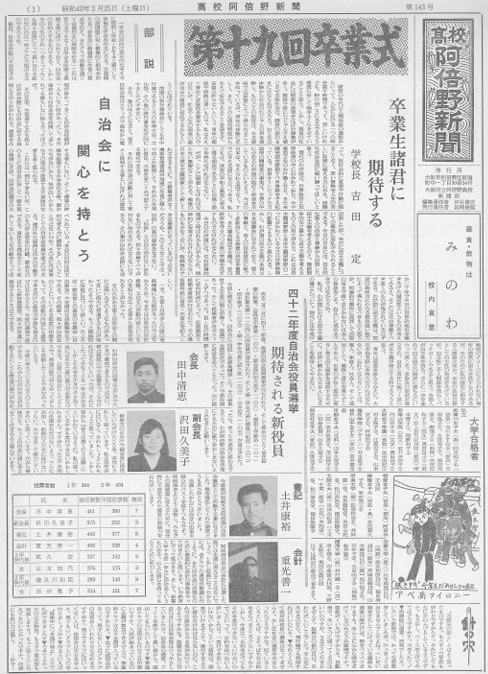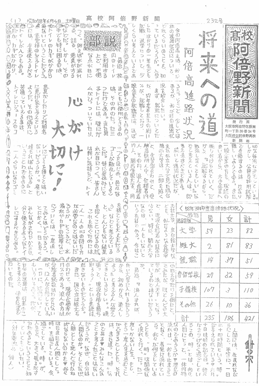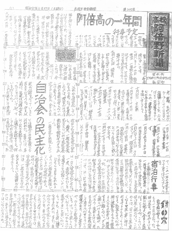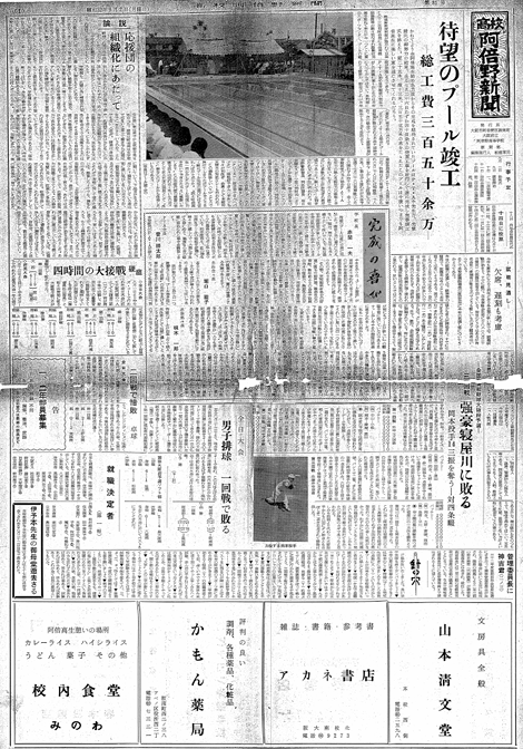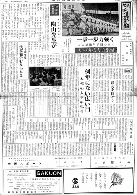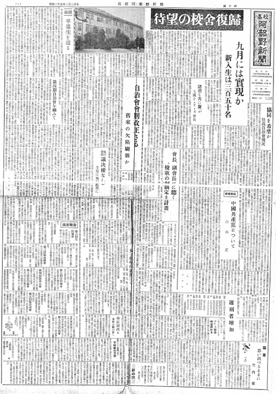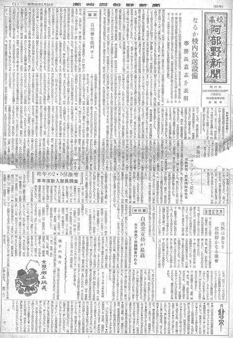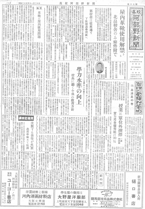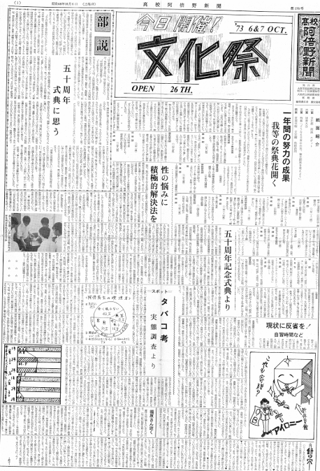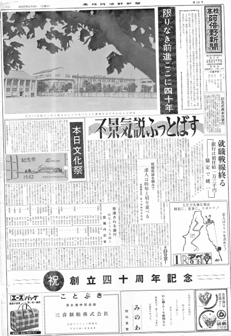 OB( OG間で連絡が廻り、その年の11月26日に有志10名ほどが芝蘭会館 に集まりました。保管されていた高校阿倍野新聞は、欠落はあるものの、昭 和23(1948)年の創刊第1号から「編集後記」に「最後の挨拶」が記されて いる昭和61(1986)年の第244号まで揃っているだけでなく、昭和 22(1947)年発行の阿部野高等女学校時代の「曙」や新制高等学校制度への 移行過程の「阿部野新聞」まで残っていました 後に平成2(1990)年発行の 第248号まで確認)。
