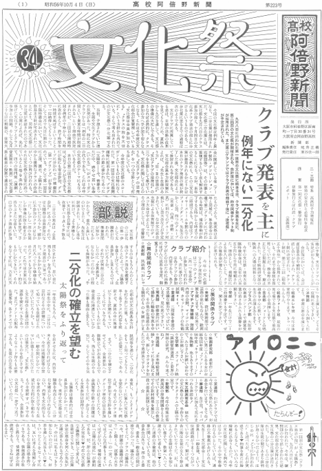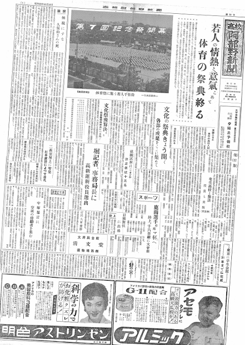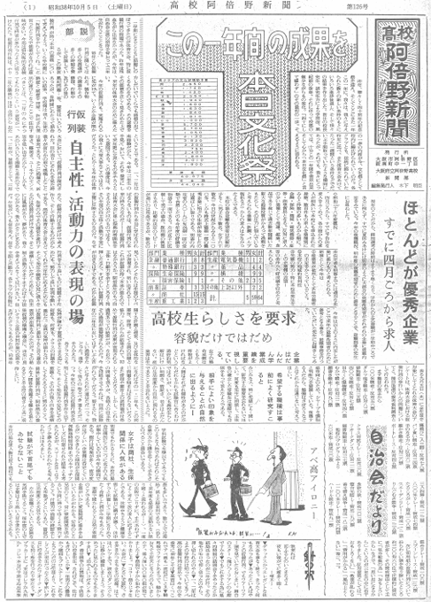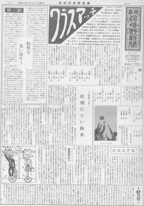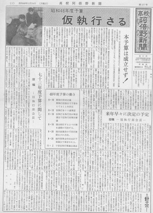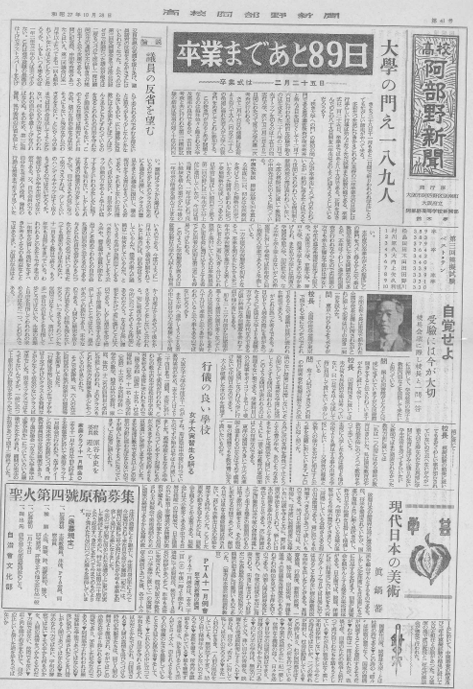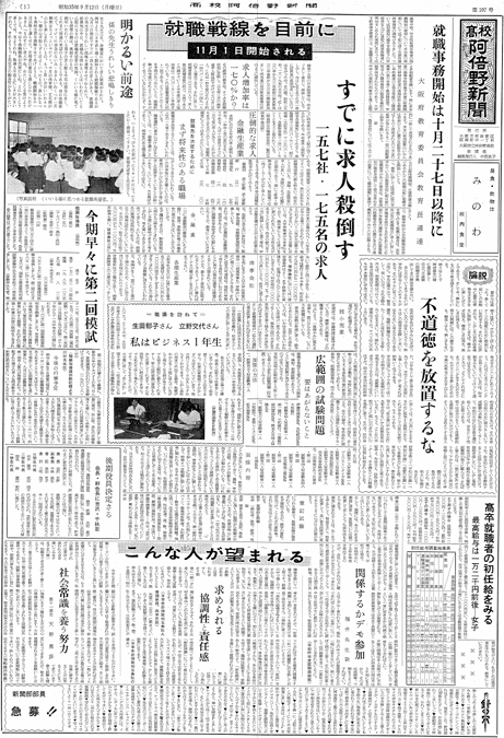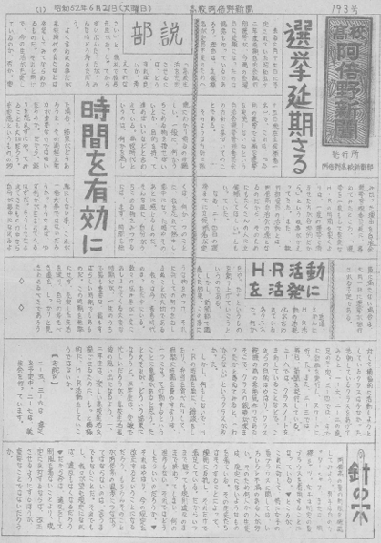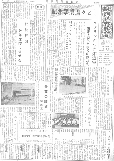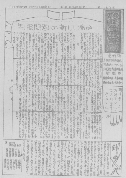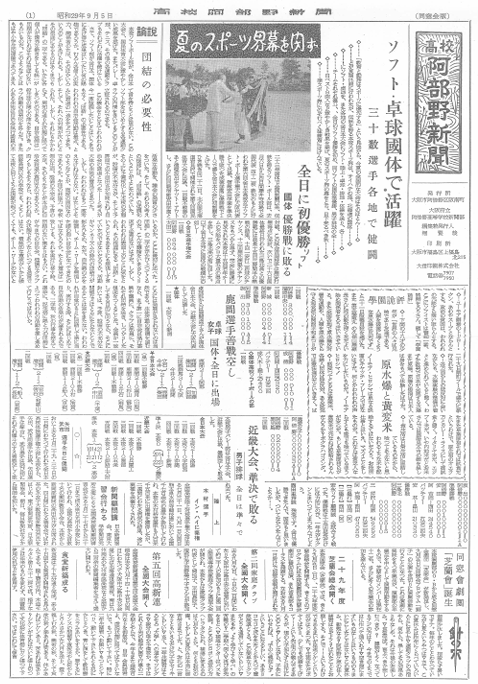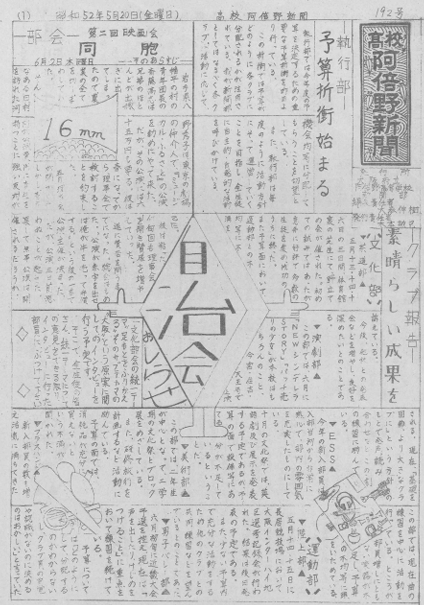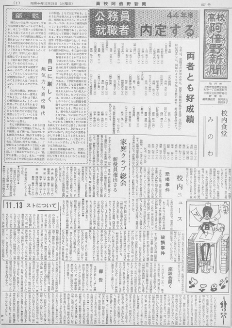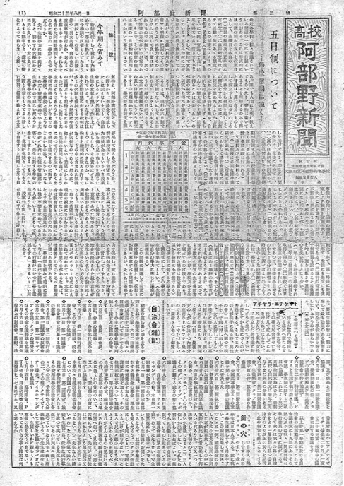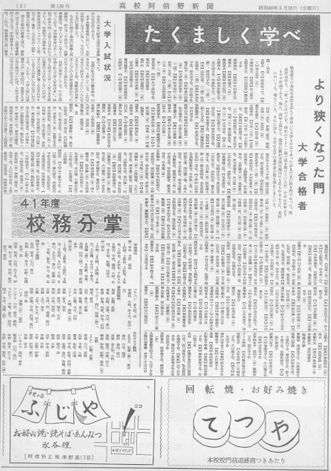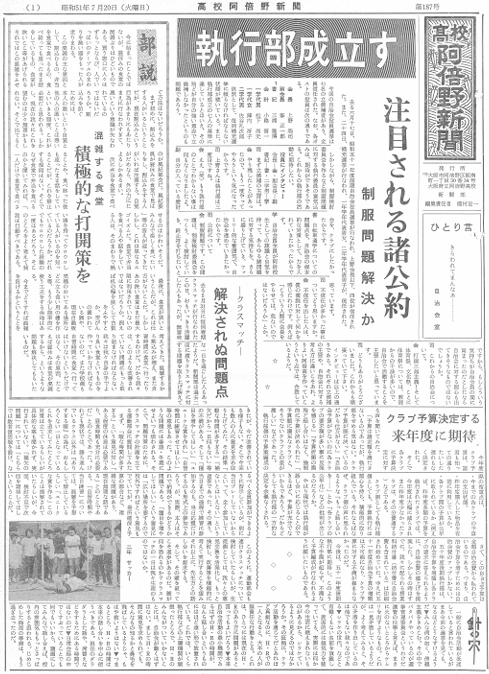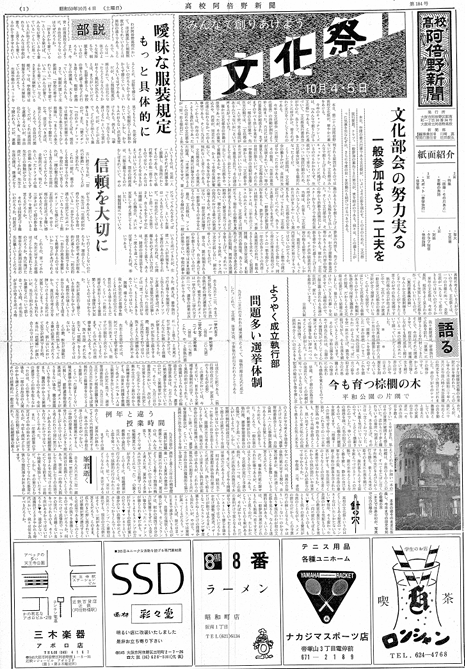 OB( OG間で連絡が廻り、その年の11月26日に有志10名ほどが芝蘭会館 に集まりました。保管されていた高校阿倍野新聞は、欠落はあるものの、昭 和23(1948)年の創刊第1号から「編集後記」に「最後の挨拶」が記されて いる昭和61(1986)年の第244号まで揃っているだけでなく、昭和 22(1947)年発行の阿部野高等女学校時代の「曙」や新制高等学校制度への 移行過程の「阿部野新聞」まで残っていました 後に平成2(1990)年発行の 第248号まで確認)。