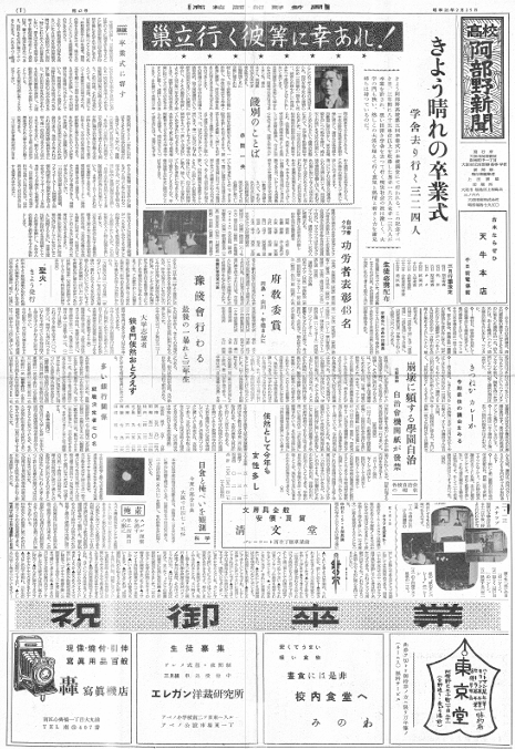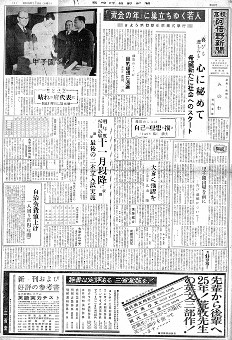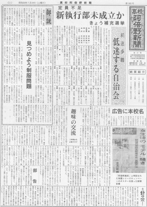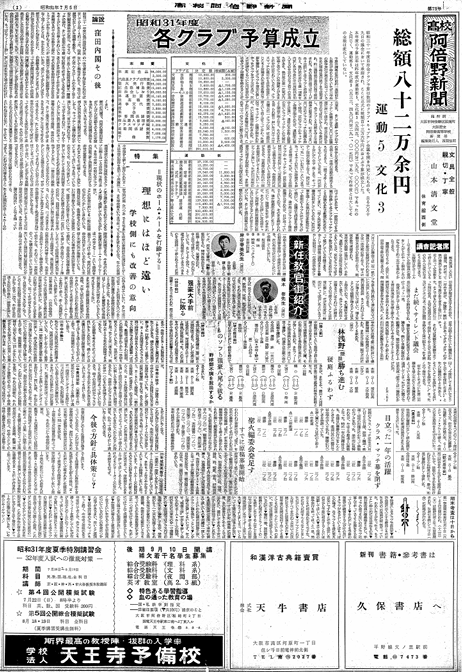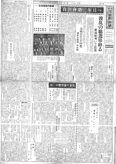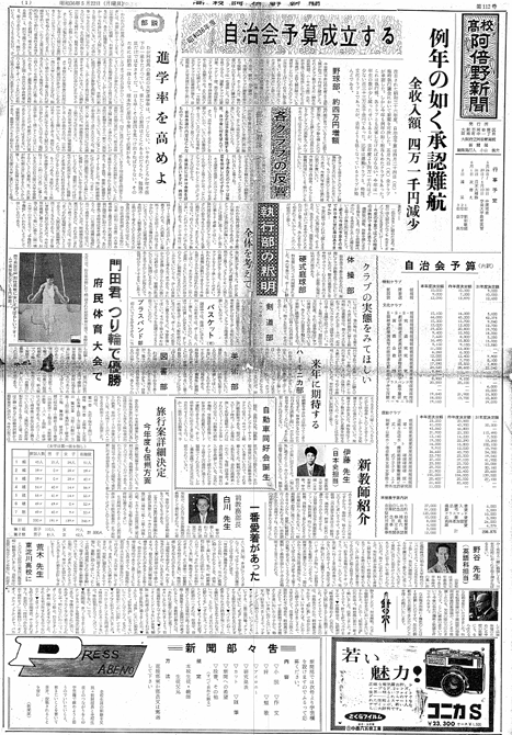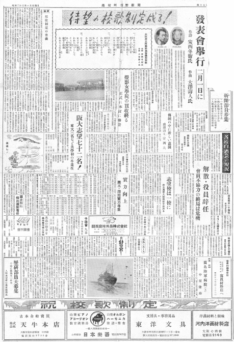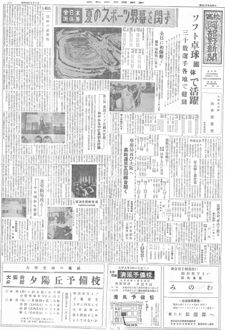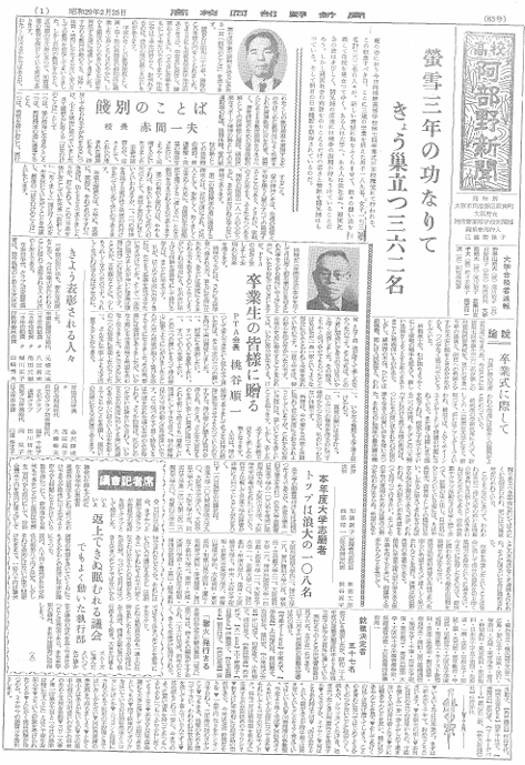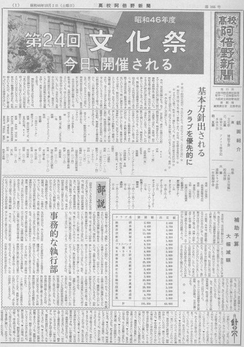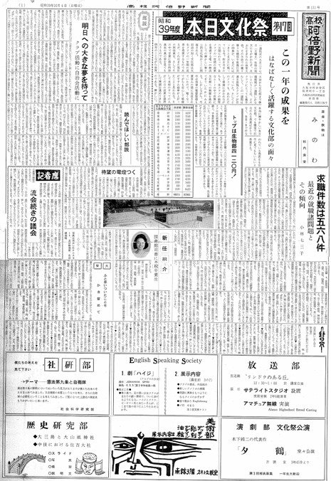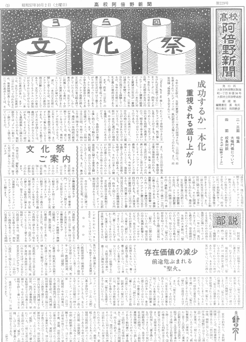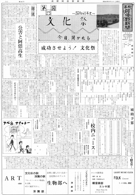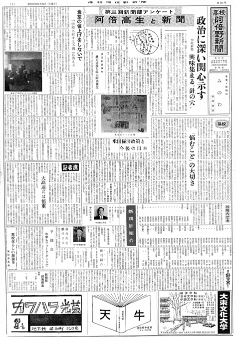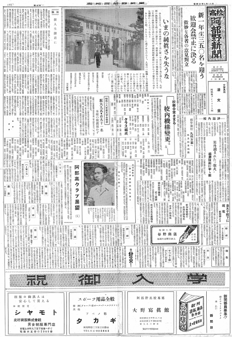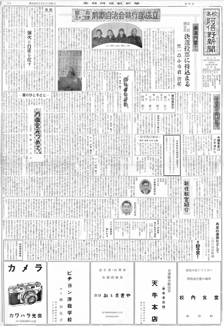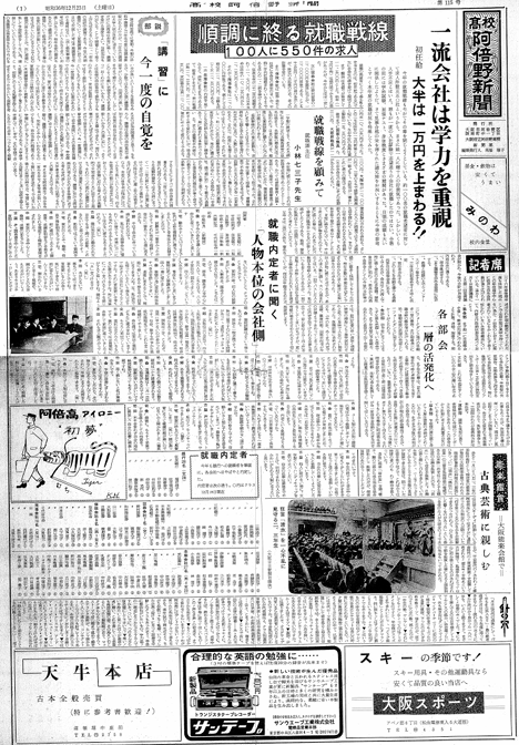 OB( OG間で連絡が廻り、その年の11月26日に有志10名ほどが芝蘭会館 に集まりました。保管されていた高校阿倍野新聞は、欠落はあるものの、昭 和23(1948)年の創刊第1号から「編集後記」に「最後の挨拶」が記されて いる昭和61(1986)年の第244号まで揃っているだけでなく、昭和 22(1947)年発行の阿部野高等女学校時代の「曙」や新制高等学校制度への 移行過程の「阿部野新聞」まで残っていました 後に平成2(1990)年発行の 第248号まで確認)。