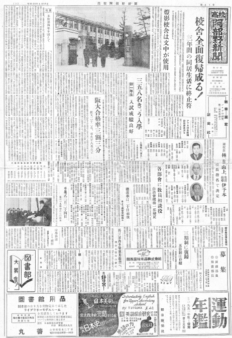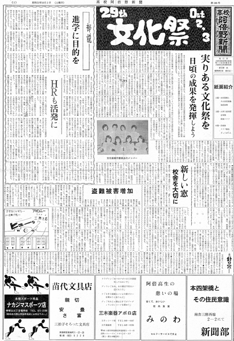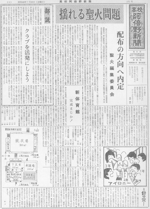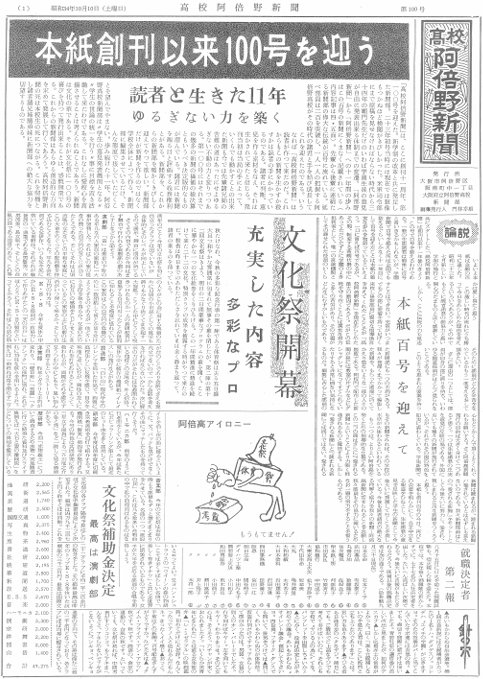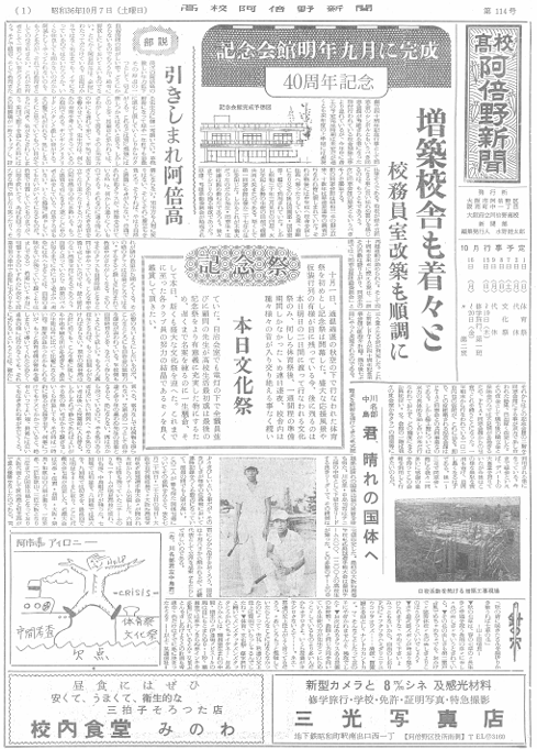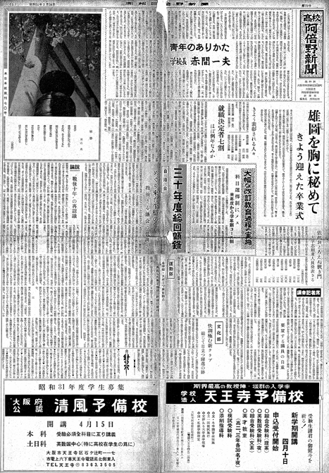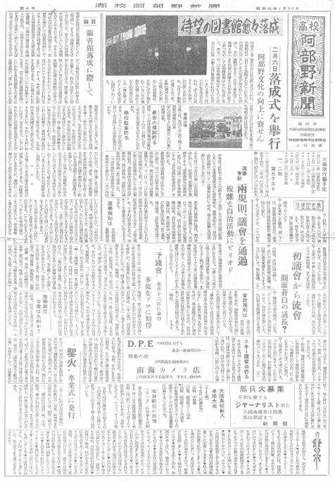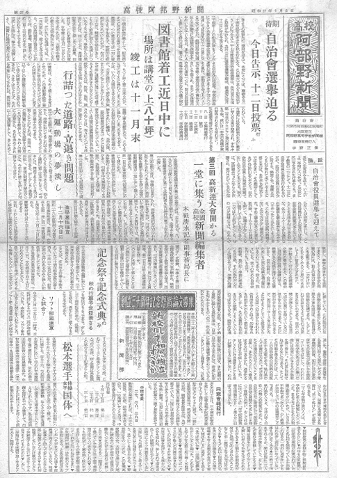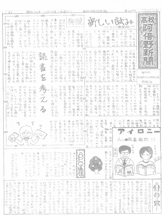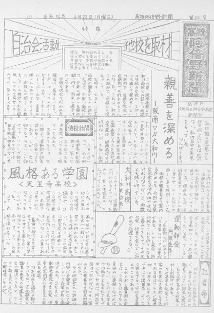 早速、飯田が江後さんと確認したところ、阿倍野高校創立100周年で改修 された芝蘭会館に、部室の消滅と新聞部自体の休(廃)部によって破棄された と思われていた高校阿倍野新聞が大量に保管されていたのです。