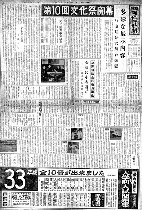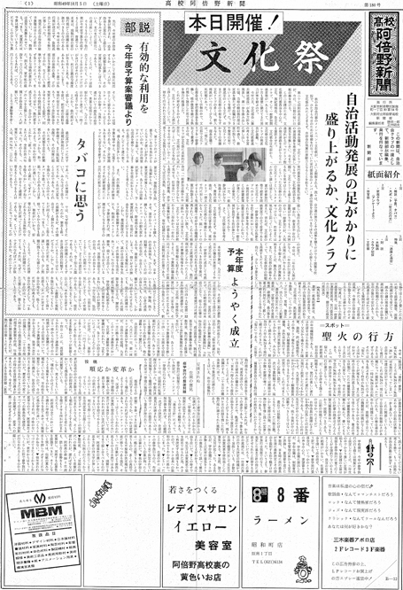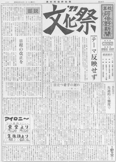 曰く、「入学式」「クラスマッチ」「体育祭」「文化祭」「修学旅行」「卒 業式」 。古い先輩方には「対住高戦」もそうでしょう。駆けずり回っ て取って来たあちこちの店舗の「広告」も。